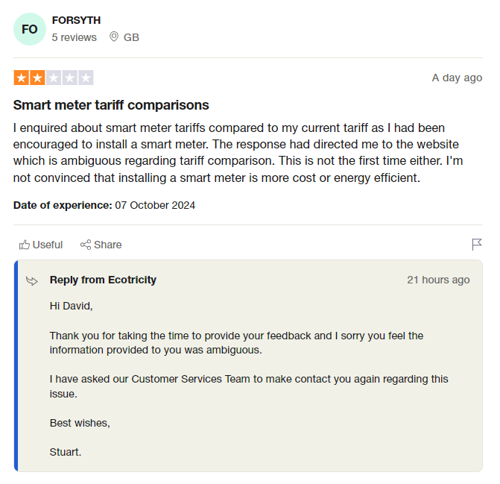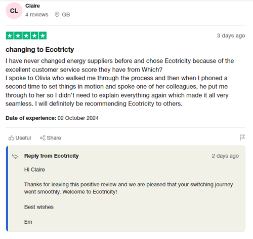 Ecotricity currently scores an average of 4.3 out of 5 on Trust Pilot.